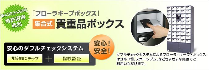 「フローラキープボックス」は、特許取得済みの集合式貴重品ボックスです。非接触ICチップと掌静脈認証を組み合わせたダブルチェックシステムにより、安心・安全にご利用いただけます。ゴルフ場やスポーツジムなど、さまざまな施設で大切な貴重品をしっかり守ることができます。